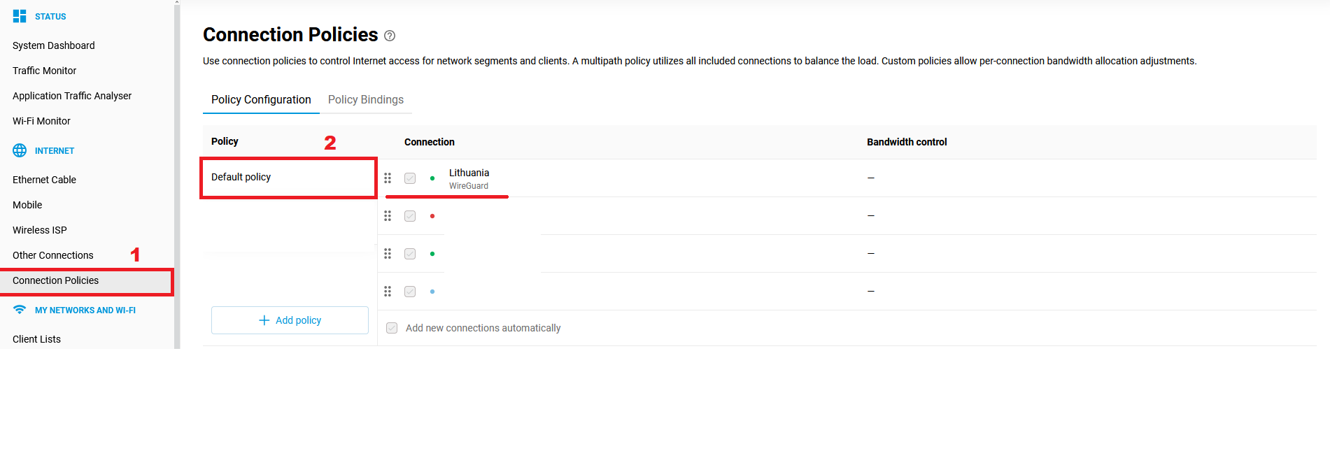 1. Open the "Connection Policies" menu and create an Internet access policy (in our example, the policy is named "VPN"):