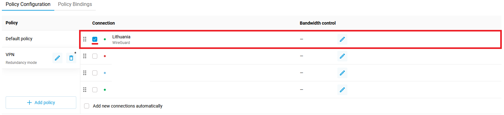8. Open the Policies menu. Under Default policy, move the newly added VPN connection to the first position and click Save: