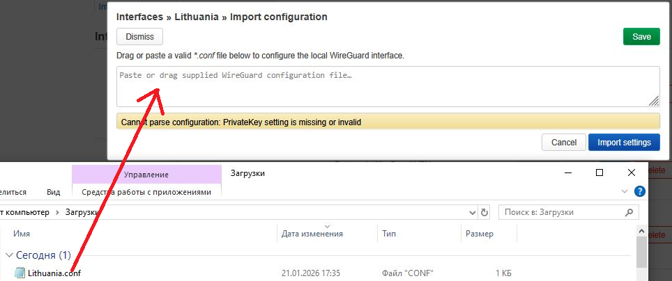 • you have a WireGuard configuration file in .conf format from your Personal Area (in our example, the configuration file Lithuania.conf will be used)