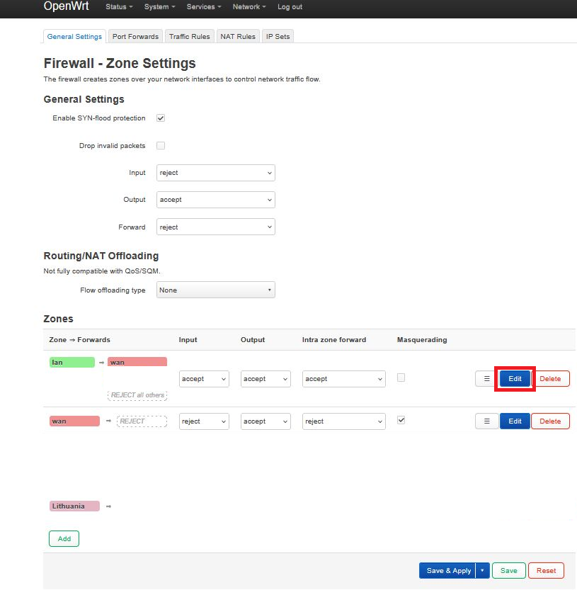 13. Click Edit for the lan zone: