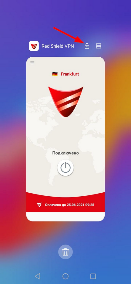 1. «Закрепление» приложения. Нужно сделать так, чтобы над приложением Red Shield VPN в списке запущенных приложений появился замок.