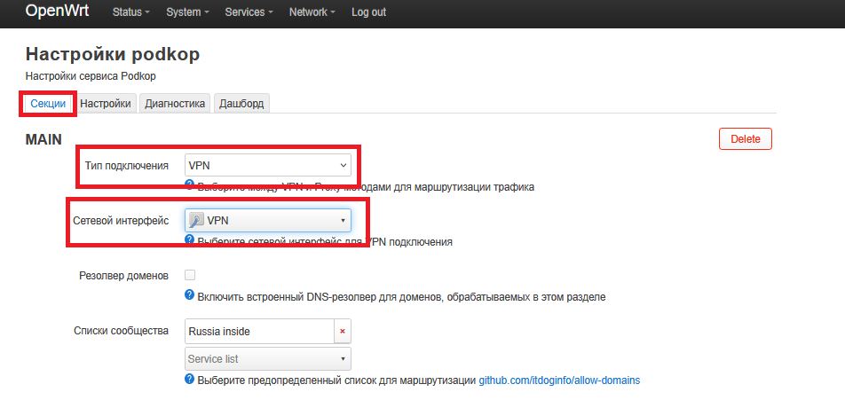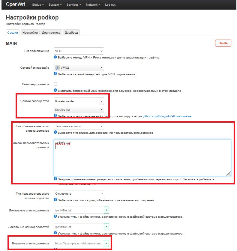 17. Перейдите: Services → Podkop и заполните поля:
